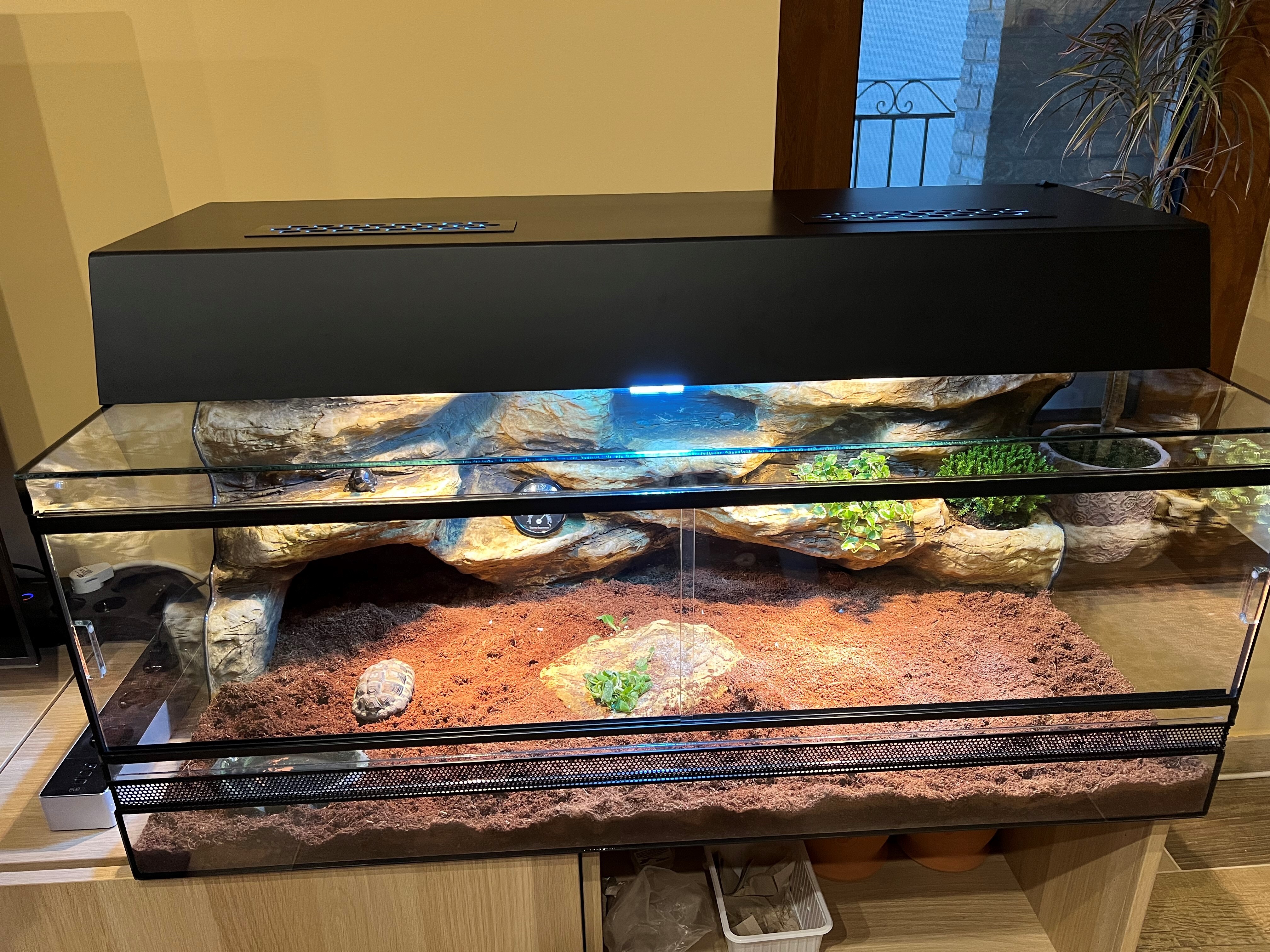 A megfelelő világítás nagyon fontos. Melegítő és UV izzóra is szükség van. A méretre gyártott lámpatestben két melegítő és egy UVB izzó kapott helyet, ezzel lehet a megfelelő hőmérsékletet és UV sugárzást biztosítani a kalcium felszívódáshoz.